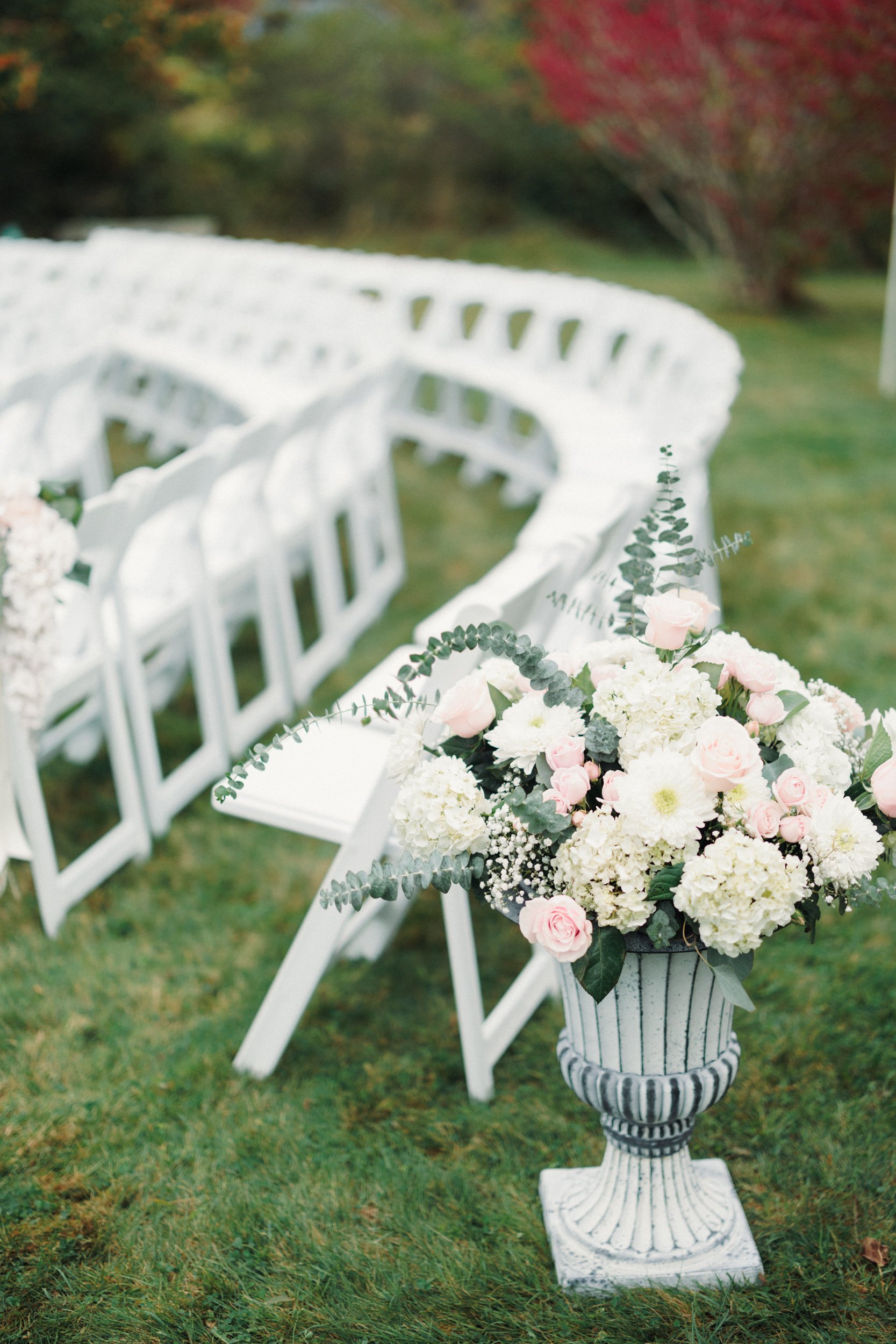 Guests witnessed the heartfelt union of the two against the backdrop of fall foliage. Following the ceremony, the festivities continued in a tent just outside the restaurant, adorned with breathtaking pink florals that added an extra touch of romance.